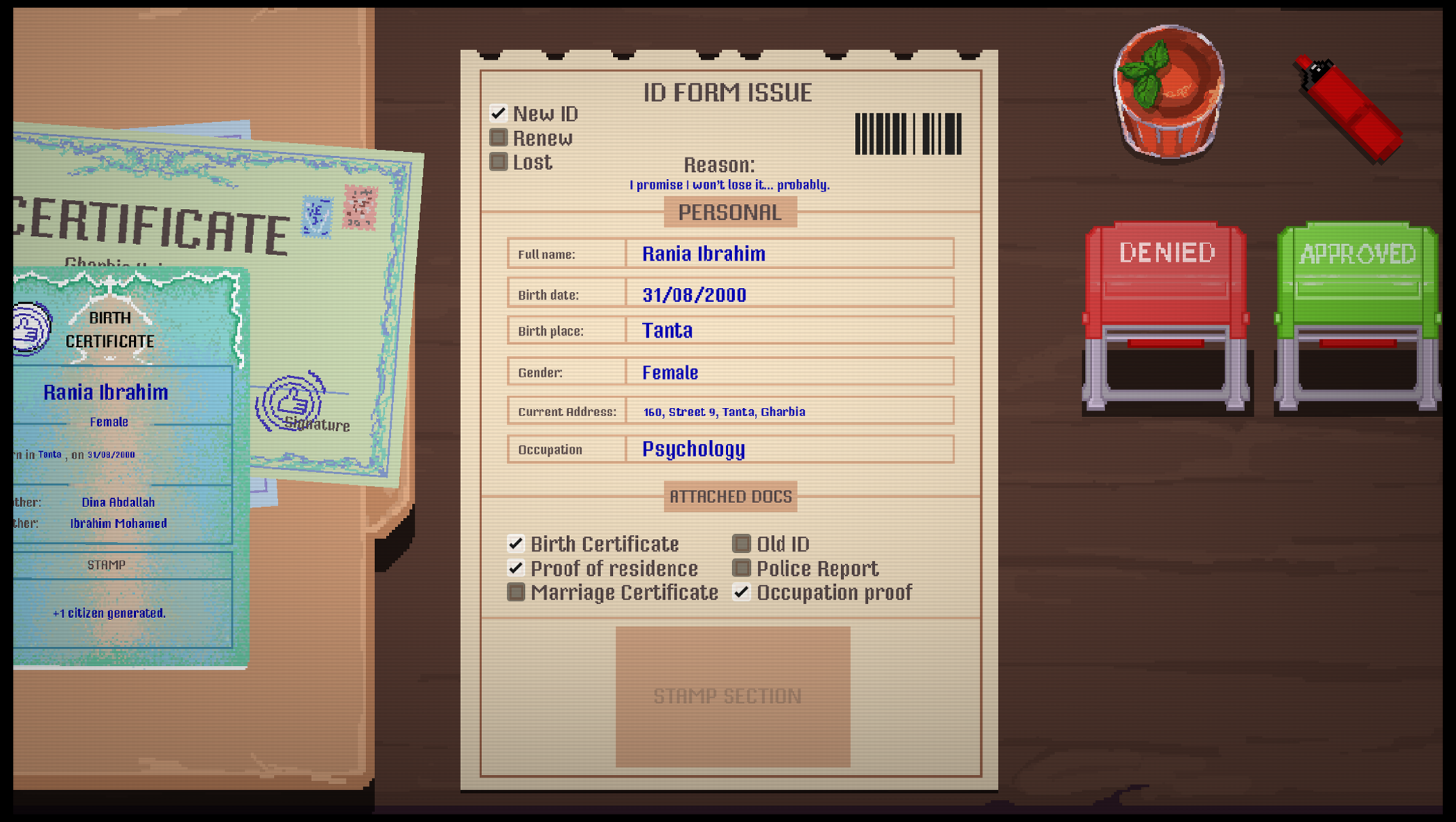 It could just be my garbage computer, but the text on the smaller documents is a bit hard to read. For example, "lab technician" on the ID looks like lob techmeijan to me. So far though it's fun, pretty good overall